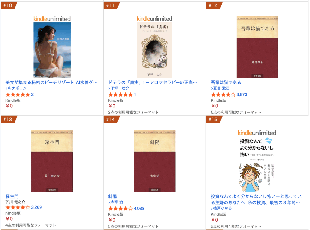 今回の結果は、「無料キャンペーン」括りなので、無料で読める本ランキングにも入っていた。著作権が切れた名著が「青空文庫」的にkindleで読めるようになっているようだ。